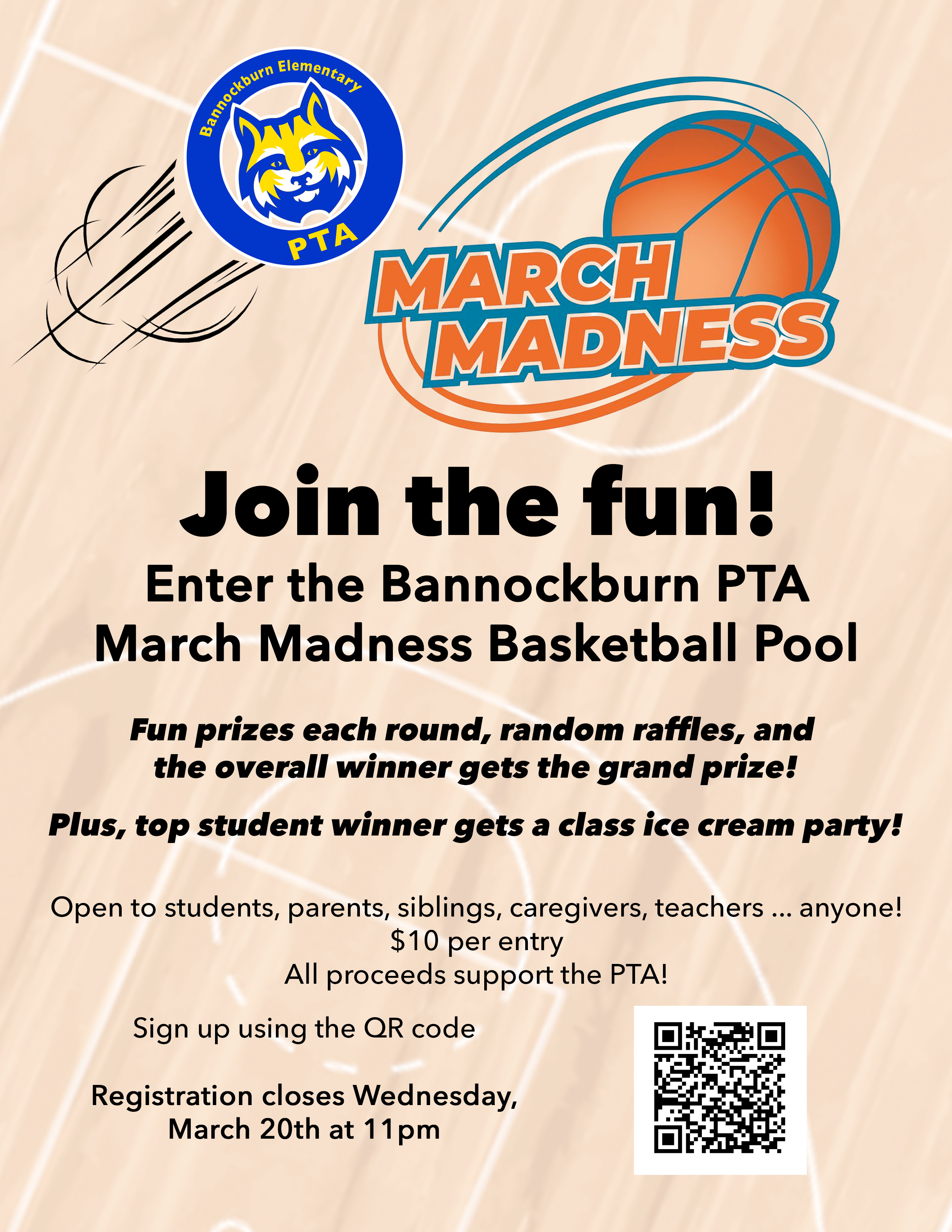 Don’t forget to fill out a bracket to participate in the first ever BES PTA March Madness Pool! Fun prizes every round, grand prizes for the winners, and random raffles too for more opportunities to win with no basketball knowledge necessary! The pool is open to everyone (students, parents, teachers, friends, etc.), and enter as many times as you like at $10 an entry. All proceeds support the PTA. Click here to sign up, or see the flyer below for more details. Brackets must be submitted before the games start tomorrow (Thursday, 3/21). Remember, your bracket name should include the participant’s name so we can identify winners!