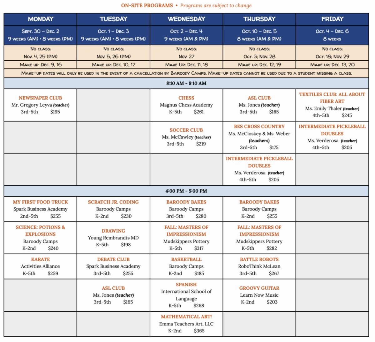 | SET YOUR REMINDERS! REGISTRATION OPENS TUESDAY, SEPTEMBER 17 @ 10AM! We are so excited to have Baroody Camps back at Bannockburn Elementary School for the Fall 2024 session providing a variety of Enrichment Programs for your children. Take a look at the fall preview below, and please click here for a link to the registration website. Club enrollment is on a first-come, first-served basis, and many of our popular clubs fill up FAST. Set those calendar reminders, update account profile(s) and payment methods in advance, and register early! If your family is experiencing financial hardship, know that scholarships have been set aside to support student participation in an enrichment activity. Please indicate your request at the time of registration. Each student may submit one scholarship application per Fall session, not for multiple programs. |