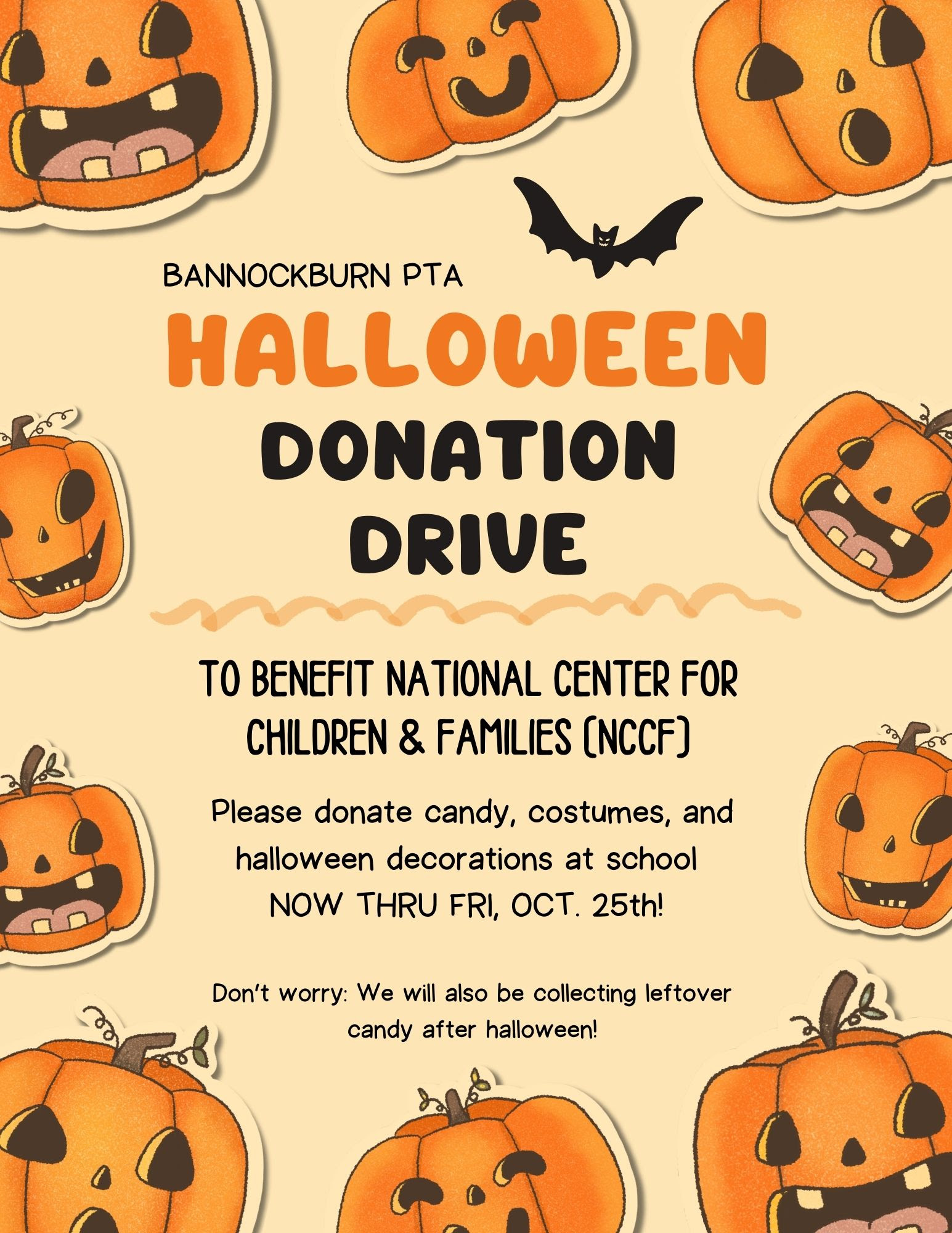 This year, we’ll again be collecting your leftover halloween candy to donate to the National Center for Children and Families – BUT we are also collecting candy, costumes, and Halloween decorations BEFORE Halloween so that NCCF can plan activities for families ahead of the holiday. You can leave your donations in the bin at school and the drive will run through Friday, October 25th.