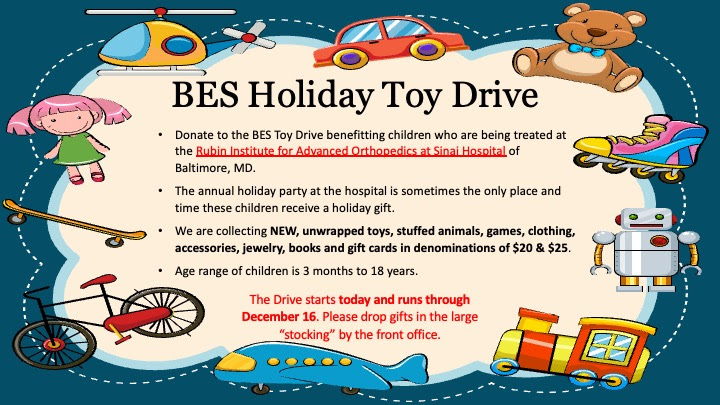 BES Holiday Toy Drive thru Dec. 16th Posted on December 5, 2024 by David Hecht Related News and Events