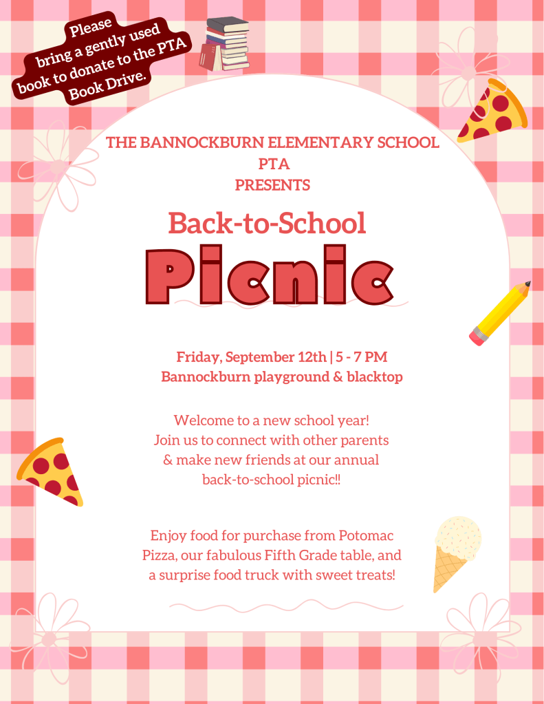 - PTA BOOK DRIVE: Don’t forget to bring your gently used books to the Back to School Picnic for our annual Book Drive! Following the picnic, you can drop off books in front of the school through September 19th. Books will go to A Wider Circle to support families in the greater DC area. Please make sure books are in good condition!