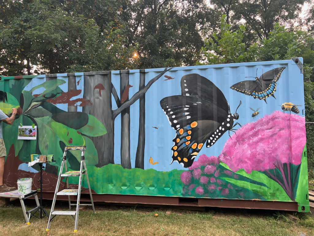 What was once a well-worn shipping container, is now the canvas for a vibrant new mural celebrating the rich biodiversity that is present right here on our school grounds. The mural was inspired by multiple years of hands-on ecological work by our neighborhood volunteer Woodland Stewardship group, which has led more than 40 workdays removing non-native invasive plants and nurturing native plant species that support more stable and healthy ecosystems.