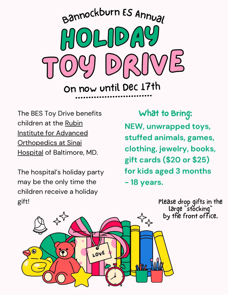 Check out the flyer above for information on the PTA’s Holiday Toy Drive, running now through Dec 17th! The large “Stocking” for donations is located inside the front entrance to school. We’ve already filled it halfway and have two weeks. We KNOW our Bobcats can fill it up before the 17th! All items go to children being treated at the Rubin Institute for Advanced Orthopedics at Sinai Hospital.