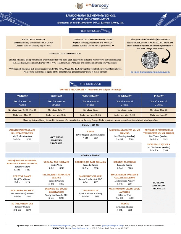 Registration for Winter Before- and After-School Clubs OPENS THIS MONDAY, DEC. 8, 10AM and runs until Sunday, January 4 (clubs are facilitated by the PTA and administered by Baroody Camps).