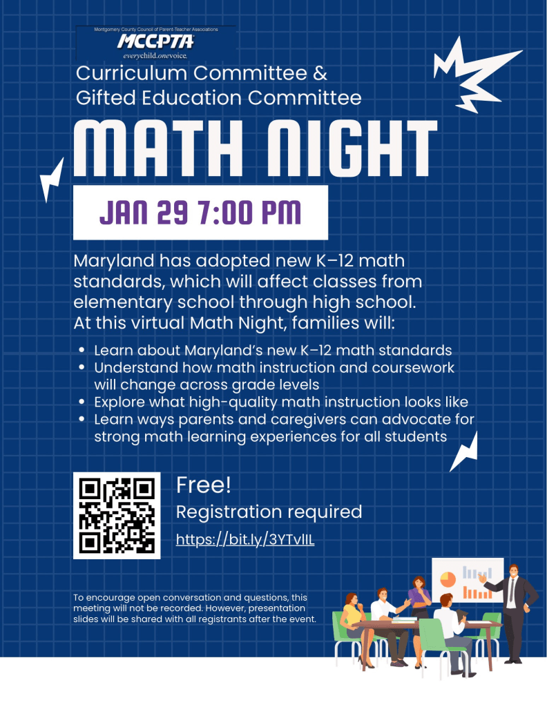 Join MCCPTA’s Curriculum Committee and Gifted Education Committee for Math Night Thu 1/29 at 7 p.m.!