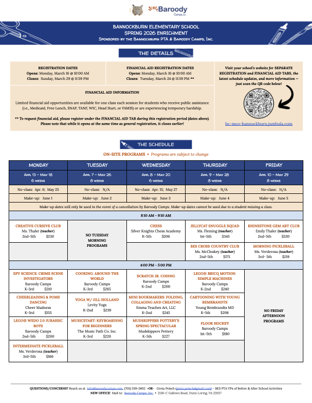 Registration for Spring 2026 Before- and After-School Clubs is now OPEN & will close Sunday, March 29th (clubs are facilitated by the PTA and administered by Baroody Camps). Proceeds support the PTA!